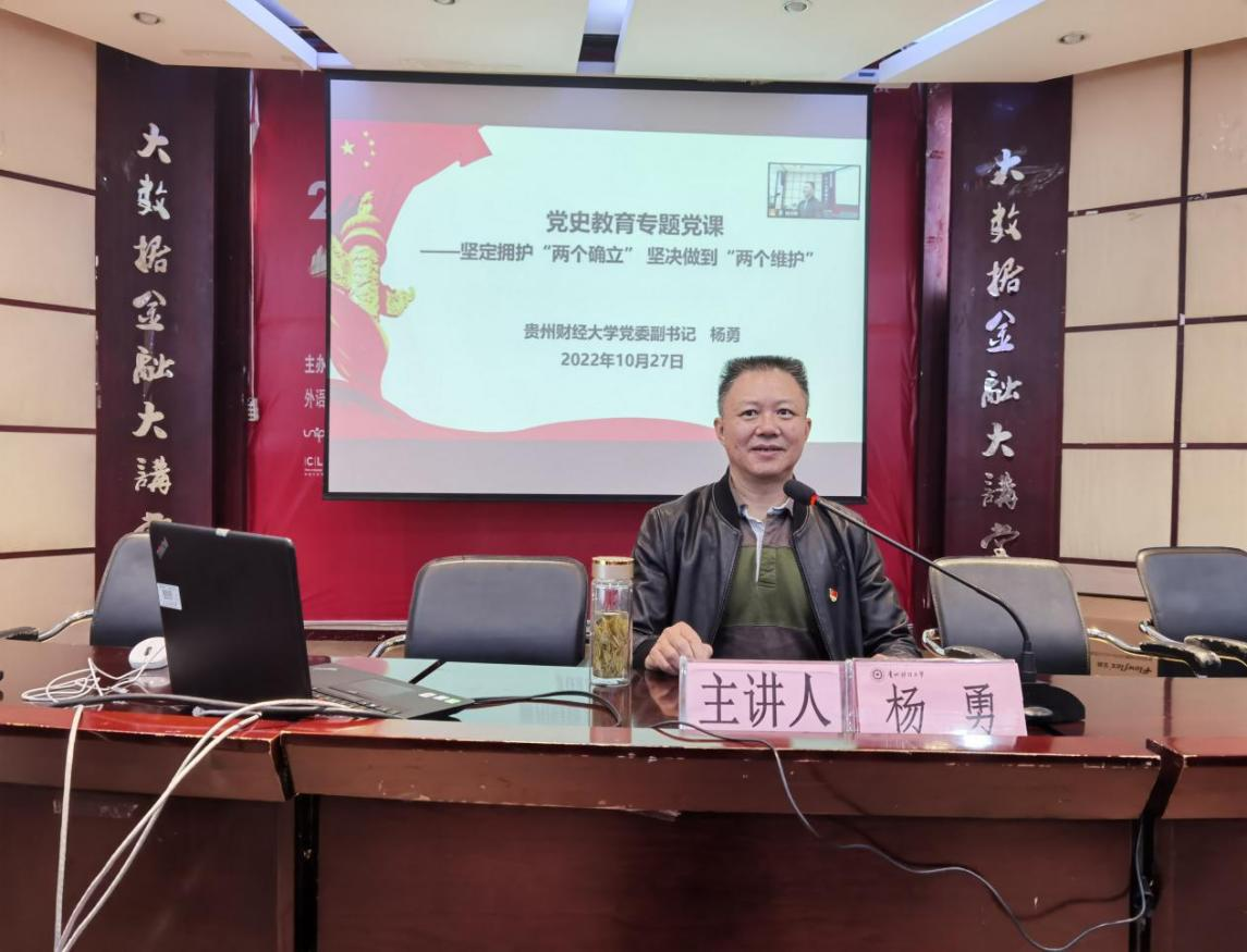 10月27日下午,校党委副书记杨勇在鹿冲关校区多功能报告厅为分管部门及联系教学单位党员上了一堂以《坚定拥护‘两个确立’,坚决做到‘两个维护’》为主题的党史专题党课。党委统战部、机关党委、工会、国际交流合作处、西密歇根乐鱼(中国)官方、国际乐鱼(中国)官方、外语乐鱼(中国)官方、高等教育研究与评估中心、档案馆的处级干部、教工党员、学生党员以及线上参加的党员,共计300余人聆听了党课。