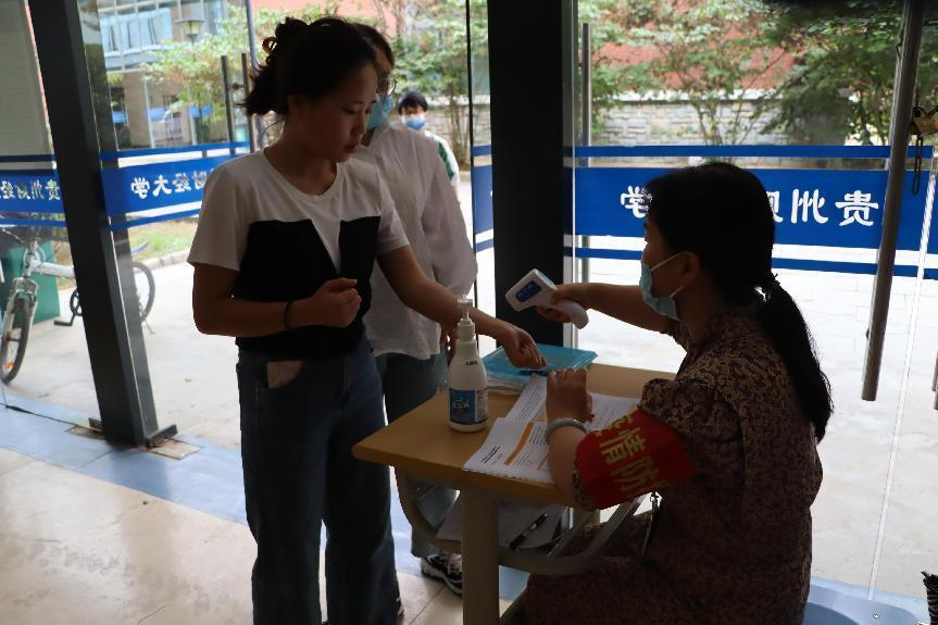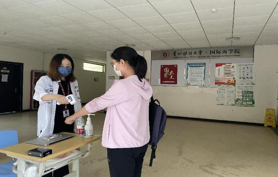 在花溪校区励学楼、博学楼、勤学楼入口,我院志愿者邢家玮、符玉梅、熊毓红、王亚娇莎、熊晶晶及邓永奎(家属)每天准时到岗,负责为进入人员测量体温,并提醒进出人员规范佩戴口罩,提醒同学们在自修室内保持安全间隔距离,为同学们构建安全有序的学习环境。