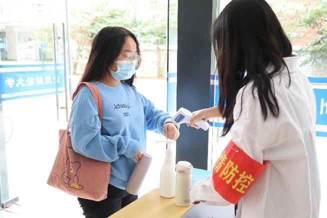 熊晶晶老师在勤学楼入口为进入自修室的同学检测体温