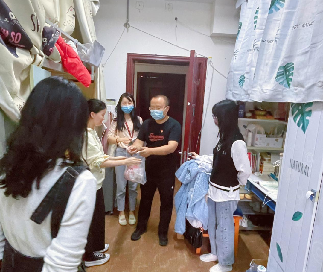 在玉兰苑2栋2022级新生宿舍,胡张林书记为新生们送上中秋月饼和防护口罩,并与同学们亲切交谈,询问他们是否适应学校的生活环境和学习情况。并提醒同学们,在疫情期间务必增强防疫意识,遵守学校的管理固定,积极配合防控工作。