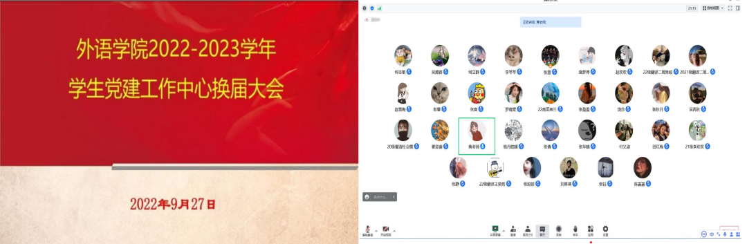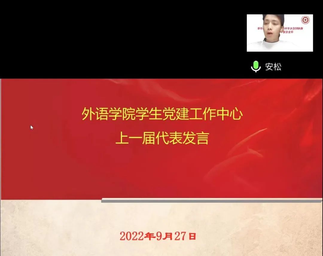 9月27日下午,外语乐鱼(中国)官方学生党建工作中心线上召开了2022-2023学年换届大会。院党委书记胡张林,院党委副书记王钊、汪欢,指导老师黄娜、陈欢出席会议,中心全体新老成员参会。会议由院学生党建工作中心新一届主任彭覃、宣传部部员王昊然主持。