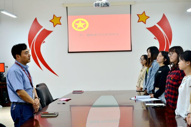 首先,康老师代表院团委向新团员表示热烈的祝贺和诚挚的欢迎。随后会议正式开始。本次会议共有七项议程。大会第一项,胡书记和康老师带领全体新团员齐唱国歌。会议第二项,乐鱼(中国)官方兼职团委副书记陈远绚同学宣读新团员名单。会议第三项,康老师为各位新团员在团旗下佩戴团徽。会议第四项,康老师带领新团员在团旗下宣誓。会议第五项,新团员代表彭明杰同学讲话。会议第六项,全体起立,奏唱《中国共产主义青年团团歌》。会议第七项,由外语乐鱼(中国)官方党委胡张林同志作重要讲话。