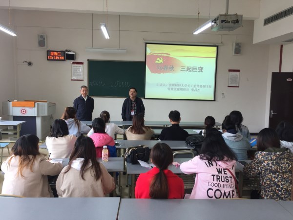 张昌杰老师以“96春秋 三起巨变”为题,扼要介绍了中国共产党建党96年的历史巨变。讲述中,年过古稀的张昌杰老师一直站在台上,用生动形象的肢体语言,用遒劲有力的粉笔板书,用时而悲恸时而激昂的声调,与同学们一同重温了中国共产党代表人民站起来、富起来、强起来三起巨大变化的艰难历程,不仅增强了同学们对党风雨兼程的认识,更激起了同学们对革命先辈的敬仰和对党的热爱。