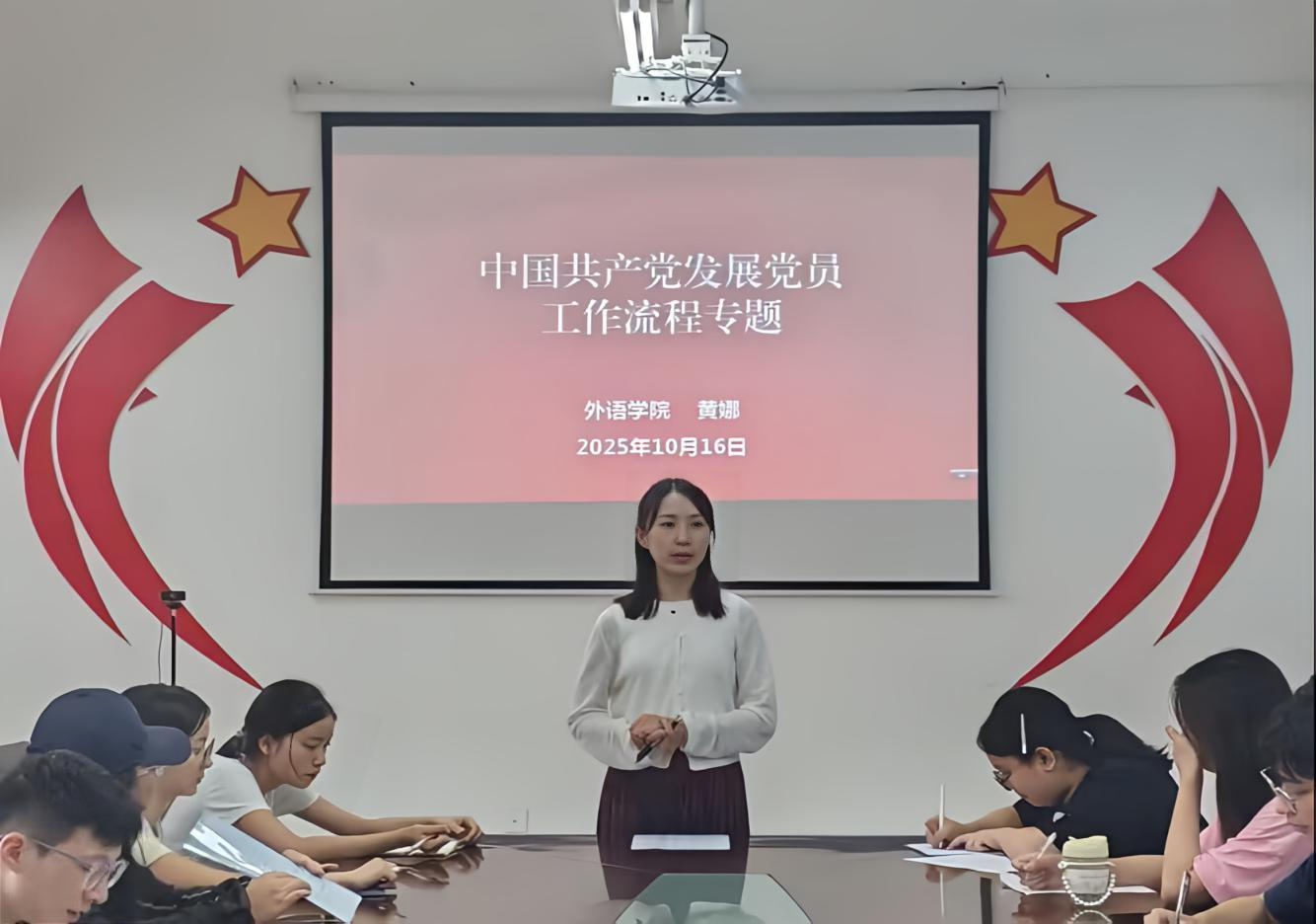 外语党委正科级专职组织员黄娜老师介绍了在新形势下发展党员的新要求和入党的工作流程。对“申请入党”“入党积极分子的确定和培养教育”“发展对象的确定和考察”“预备党员的接收”“预备党员的教育、考察和转正”5个发展党员的工作阶段进行了深入阐述。最后黄娜老师表示,发展党员是党的建设新的伟大工程的一项基础性工程,是党员队伍持续壮大的关键因素,希望全体学员强化理论武装,不断成长成才,早日成为一名合格的共产党员。