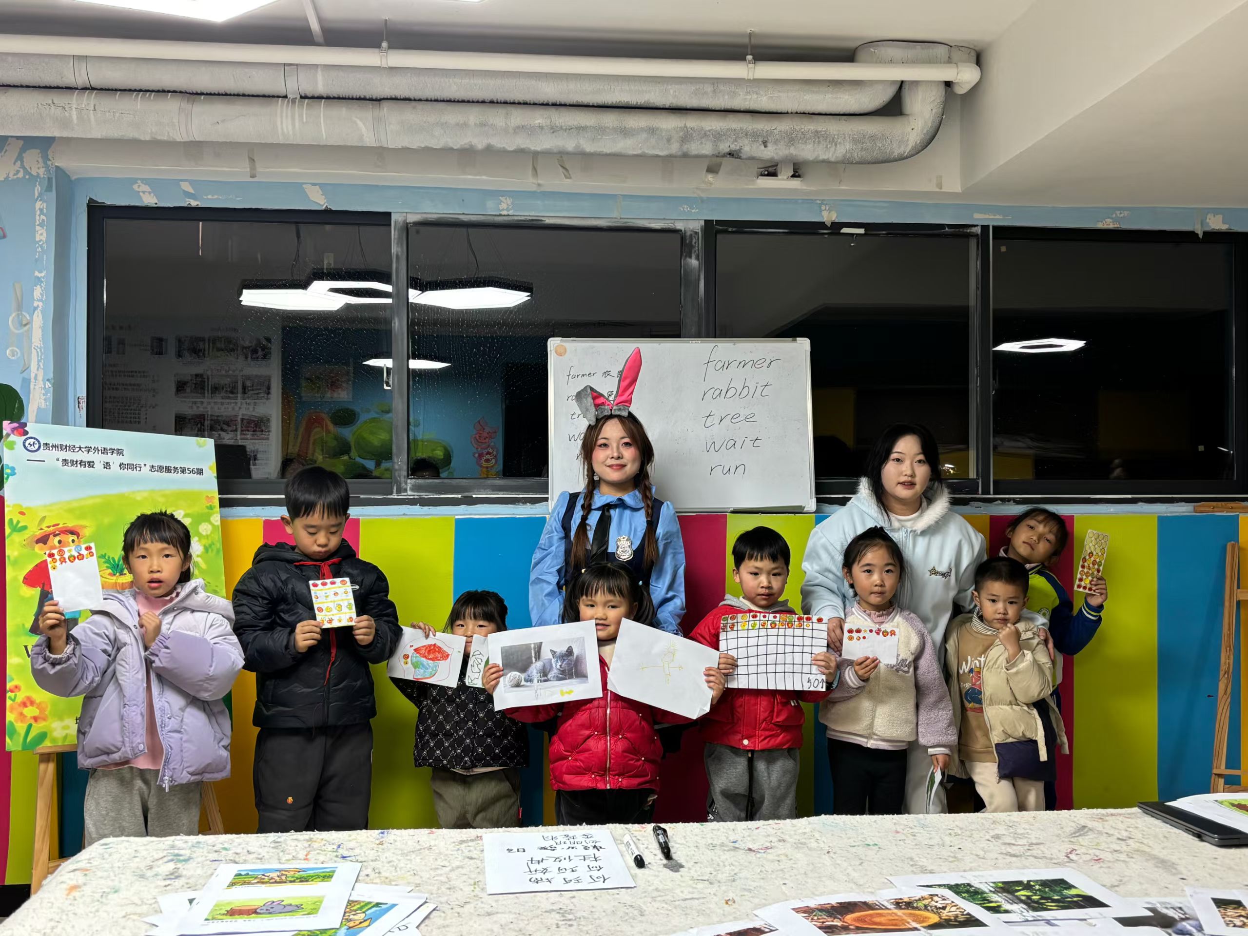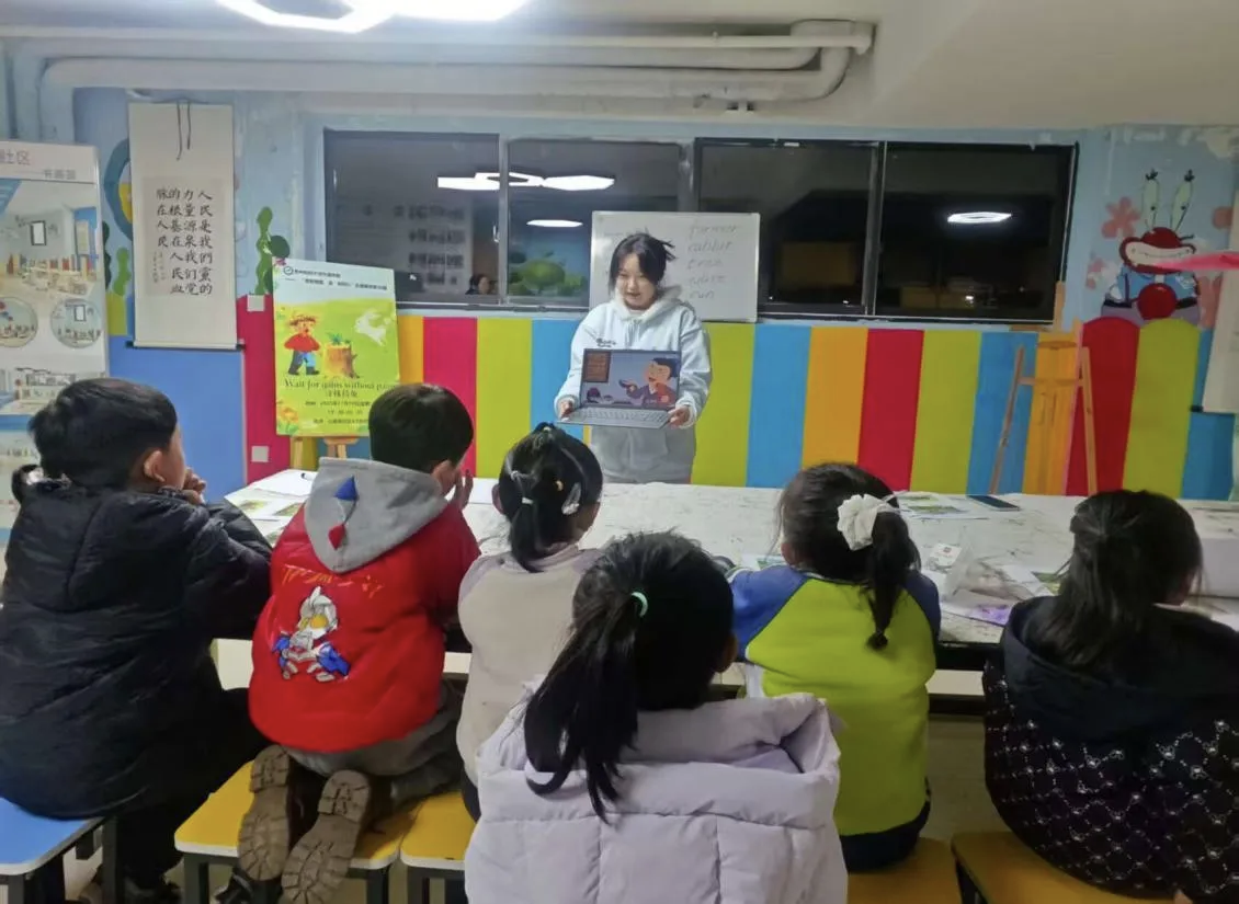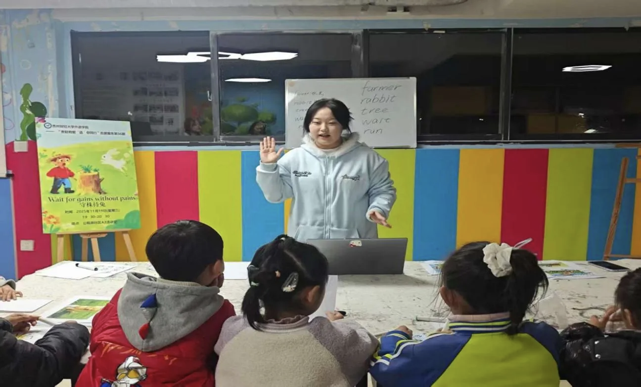 2025年11月19日19:30,外语乐鱼(中国)官方“贵财有爱‘语’你同行第56期活动在贵州财经大学西校区公租房社区A1活动室顺利开展。志愿者王承菊、冯周、陈光艳、刘汉燊共同为小朋友们带来了一堂别开生面的英语趣味课堂。本期活动以“Wait for gains without pains”(《守株待兔》)为主题,巧妙地将经典寓言与趣味游戏相融合,让孩子们在亲身体验中读懂寓言内涵,在快乐互动中感受英语魅力。
