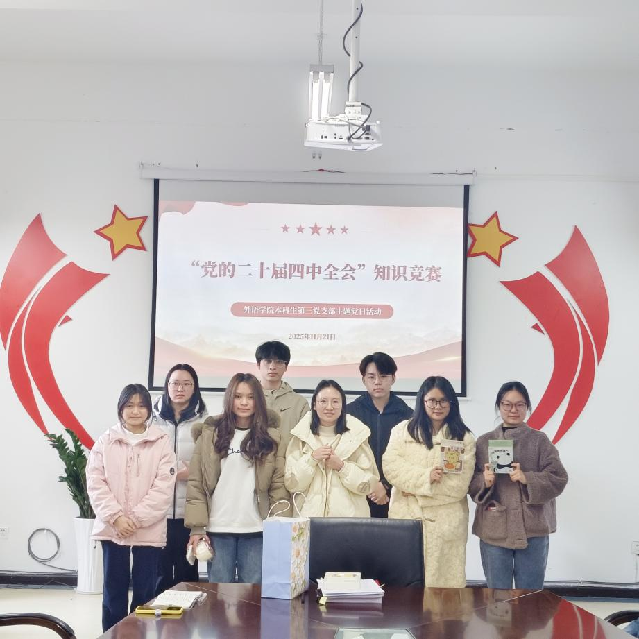 为深入学习贯彻党的二十届四中全会精神,切实加强支部思想建设、提升组织凝聚力,以高质量党建引领青年学子成长成才,2025年11月21日下午,外语乐鱼(中国)官方本科生第三党支部在励学楼301会议室组织开展了“红色血脉赓续行 形势政策领航程”主题党日活动。支部全体党员、发展对象以及入党积极分子共同参加了此次活动,活动由支部书记陈欢主持。