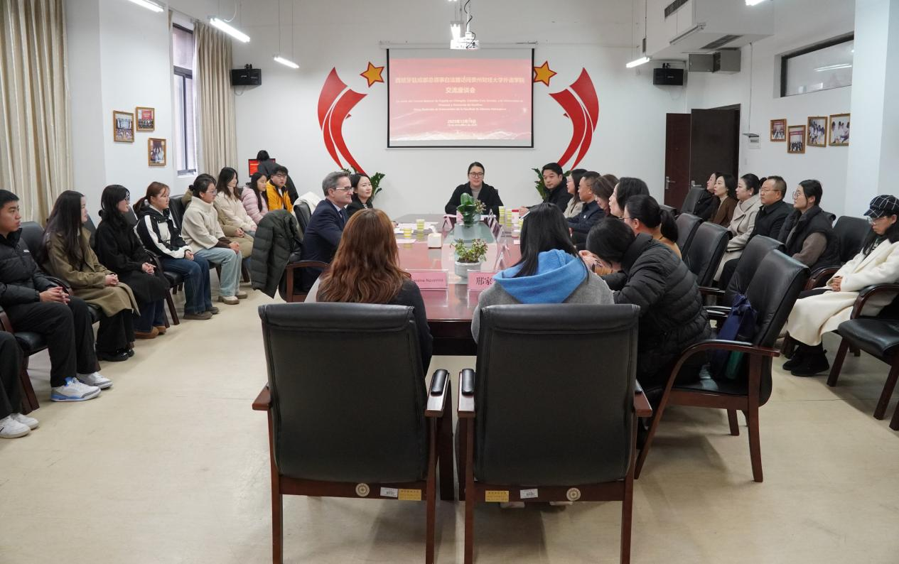 2025年12月18日上午,西班牙驻成都总领事白洁路(Cándido Creis Estrada)一行访问贵州财经大学并在外语乐鱼(中国)官方开展交流座谈。校党委副书记李娅出席并致辞。外语乐鱼(中国)官方领导班子成员、国际交流合作处教师代表、外语乐鱼(中国)官方西班牙语专业、葡萄牙语专业师生代表、外籍专家等参加座谈,会议由外语乐鱼(中国)官方副院长(主持工作)刘利音主持。