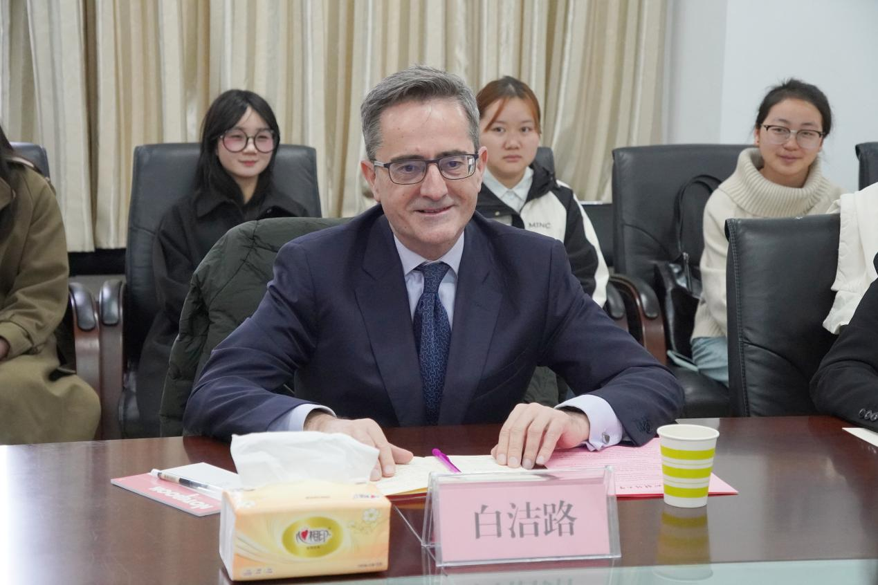 白洁路总领事对贵州财经大学的热情接待表示感谢。他表示,西班牙高度重视与中国的双边关系,领事馆致力于推动西班牙与中国西南地区,包括贵州,在经贸、教育、文旅等多维度的联系。他充分肯定了贵州财经大学西班牙语专业师生在促进贵州与西语世界沟通中所发挥的桥梁作用,并表达了进一步支持学校西语学科建设、鼓励更多拉美地区高校与贵财大开展校际合作、为学生提供更多交流与实习机会的意愿。他真切谈到,中国乃礼仪之邦,深厚的礼仪文化令人敬仰,期待进一步学习与借鉴中国的文化精髓、语言智慧与发展经验,持续推动两国文明交流互鉴。