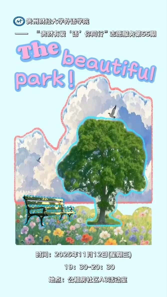 你知道“公园20分钟效应”吗?走进大自然,呼吸新鲜空气,让身心愉悦放松。让我一起回到孩童时代,开启一场关于“公园”的英语探险!“贵财有爱 ‘语’ 你同行”志愿服务第55期,将以“The Beautiful Park” 为主题,采用儿歌、游戏和绘画等多样形式,带领孩子们在花、树、长椅等公园元素中,轻松接触英语知识、感受表达乐趣。